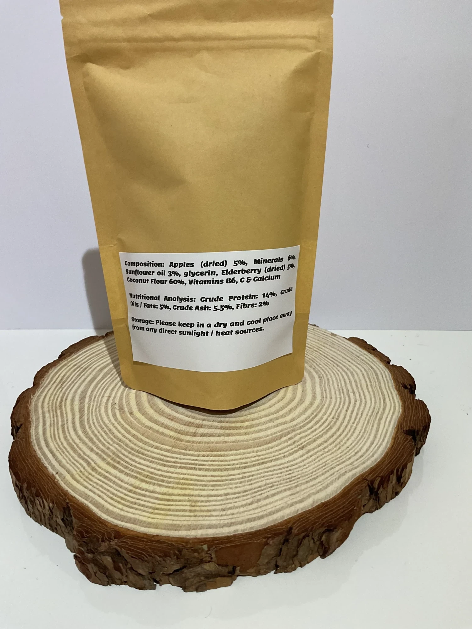 Composition: Apples (dried) 5%, Minerals 6%, Sunflower oil 3%, glycerin, Elderberry (dried) 5%, Coconut Flour 60%, Vitamins B6, C & Calcium