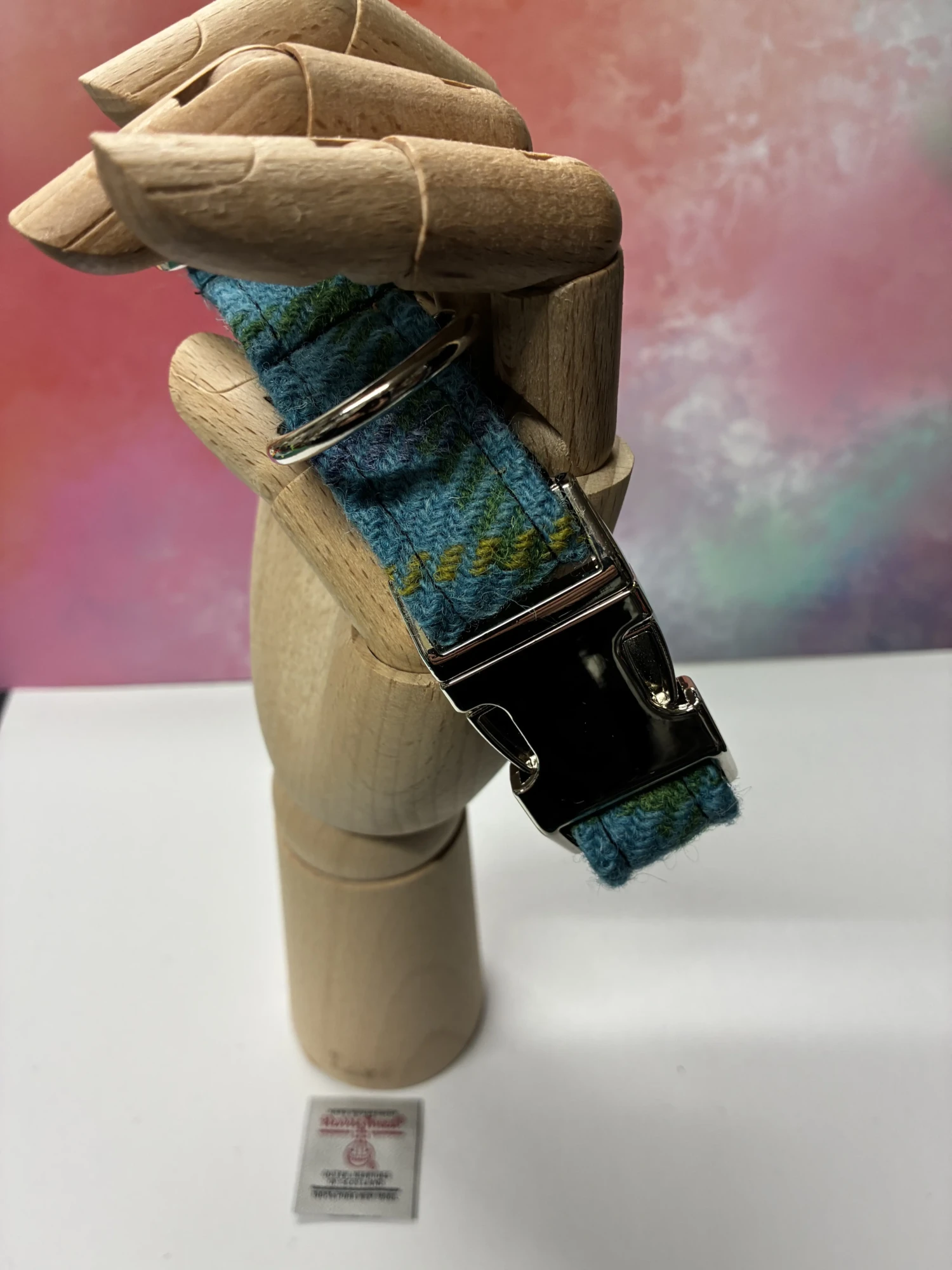 Upgrade your dog’s look with our Harris Tweed large Teal Check dog collar. This large-size collar, fitting necks from 14 to 19 inches and 1 inch wide, offers both style and durability. Crafted from authentic Harris Tweed, its sophisticated Teal Check pattern exudes timeless elegance. Equipped with heavy-duty silver metal hardware, this collar ensures strength and longevity. Perfect for larger breeds, this collar combines fashion and function, making it an essential accessory for your beloved pet.