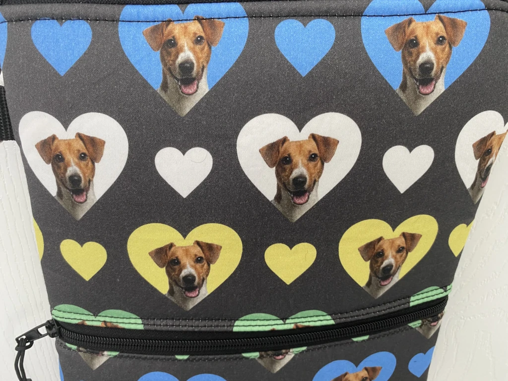 “Shop the stylish Jack Russell Crossbody Dog Walking Bag! Measuring 9” x 11”, it features a waterproof lining, canvas back, 2 pockets & an adjustable strap. Perfect for dog walks & everyday use. Order now!”