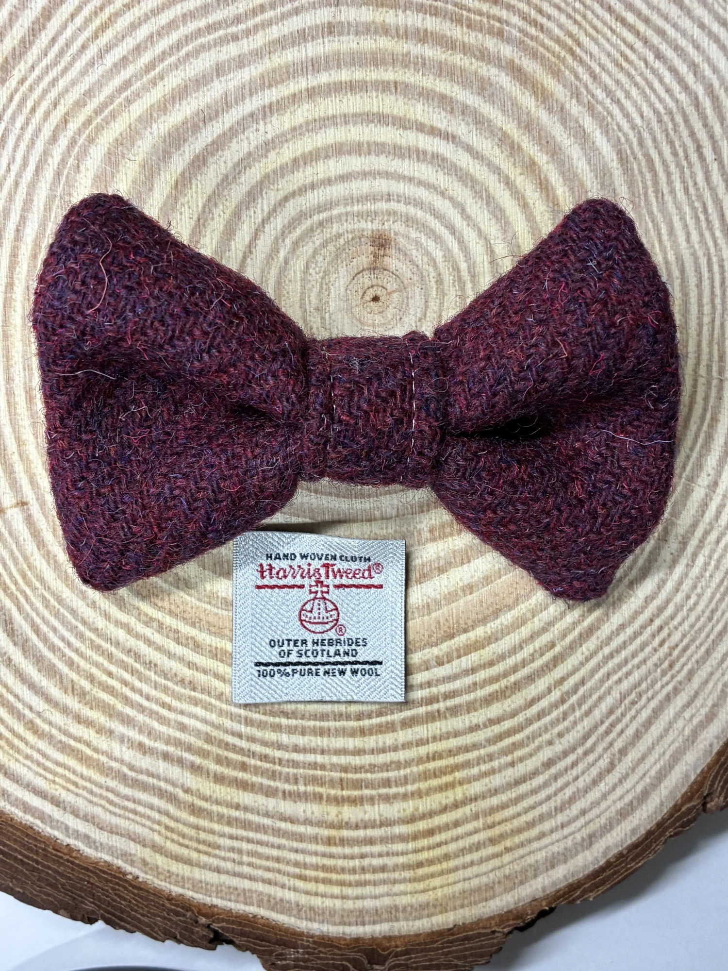 Give your furry friend a touch of luxury with our handmade burgundy Harris Tweed dog bow tie. Made from authentic Harris Tweed, this stylish medium-sized bow is a perfect addition to your dog’s collar for everyday elegance or special occasions.