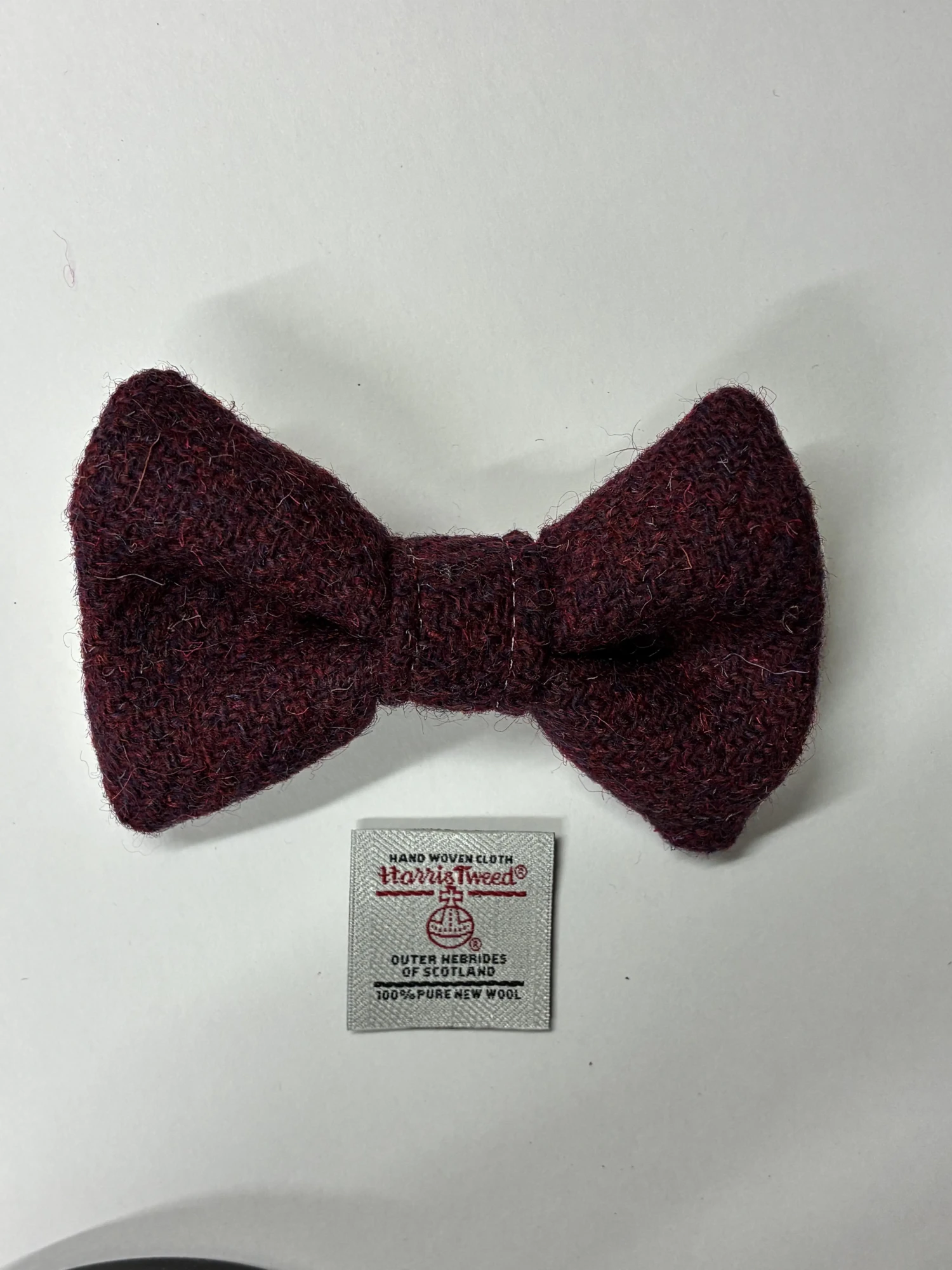 Handmade burgundy tweed dog bow tie crafted from authentic Harris Tweed. Perfect for stylish dogs, this medium-sized bow slides easily onto any collar with its elastic loop.
