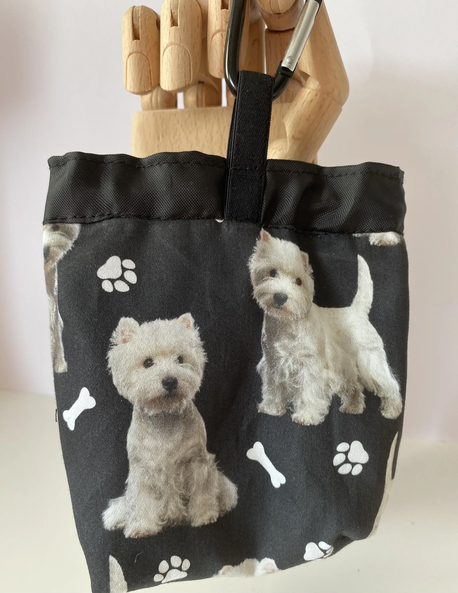 Stay stylish on walks with the West Highland terrier Dog Treat Bag Features a cotton paw print exterior, waterproof lining, drawstring closure, and metal carabiner for easy carrying. Perfect for treats!